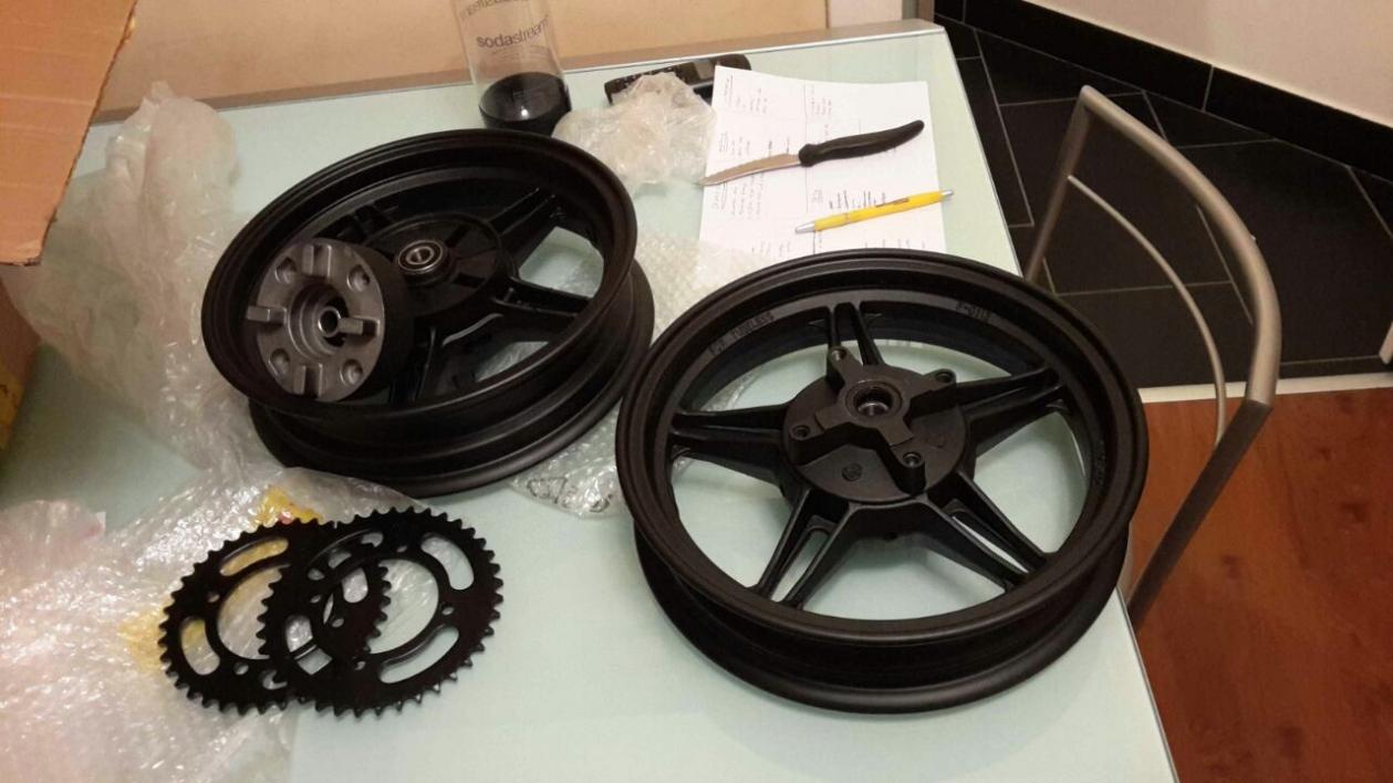 Nel mentre mi sono arrivati i cerchi nuovi, quelli che montava erano di disegno diverso davanti/dietro e quello dietro aveva la sede di un cuscinetto non perfetta (maledetti cinesi...). I nuovi già che c'ero li ho presi con il parastrappi, che male non fa mai :)