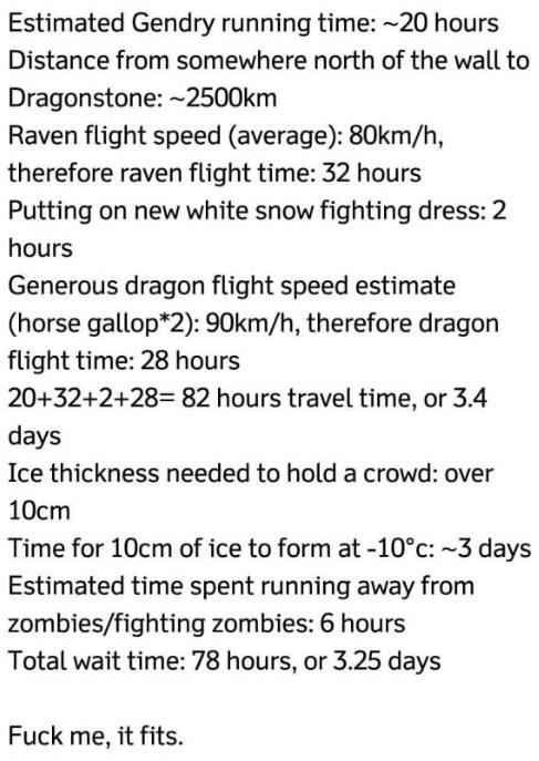 Gendry torna alla barriera, parte un corvo che si fa oltre mezzo continente fino a Dragonstone, Dany parte e si rifa mezzo continente piu la parte oltre la barriera.
