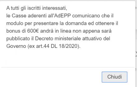 "A tutti gli iscritti interessati, le Casse aderenti all ’Adepp comunicano che Il modulo per presentare la domanda ed ottenere il bonus di 600€ andrà in linea non appena sarà pubblicato il Decreto ministeriale attuativo del Governo (ex art.44 DL 18/2020)."