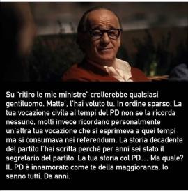 Poi vedo la gente impazzita che sembra non aver capito il gioco e si affretta ad infamare giustamente Renzi, ma senza capire il meccanismo che ci sta dietro. Lui punta a diventare il nuovo Casini, in un mondo diviso tra 3 partiti di maggioranza un partito di centro al 2% rimane una grande stampella specie per il prossimo governo di destra.
