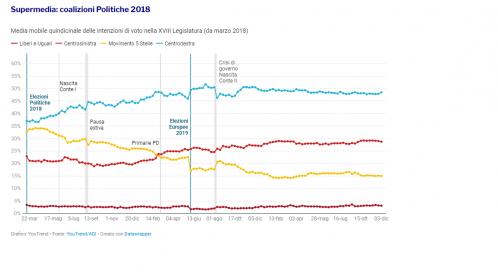 Non vedo tutte queste fluttuazioni sulle medie quindicinali delle medie dei sondaggi, se consideri le coalizioni. Poi è vero che può succedere di tutto, ma la situazione mi sembra abbastanza consolidata se consideri che l'unico vero grosso cambiamento è lo spostamento da 5S a CDX, e vedo difficile una resurrezione dei pentalotti, così come la nascita di qualche soggetto politico in grado di riportare quei voti nell'alveo di una coalizione dichiaratamente ostile al CDX.
