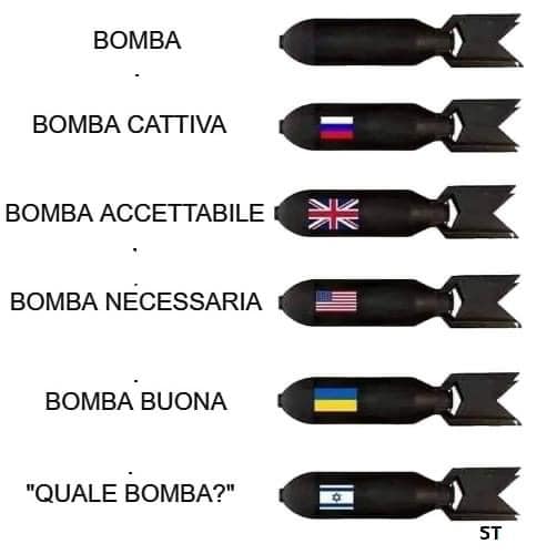 detto questo chiudo perchè qui stiamo passando dal diritto a difendersi da decenni di attacchi a una pulizia etnica bella e buona, con il silenzio totale di chi per una cosa molto minore ( come nei balcani) ha accopato migliaia di civili per 1 mese,. a no spetta adesso che ci penso ma israele sta facendo come la nato in serbia e a belgrado nel 1999, e gia questo è quello che fa l'occidente, finche non trova qualcuno che gli fa un culo come un canestro in giro per il mondo e credimi lo trova sempre ultimamente.
