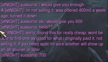a proposito di source, mi ha addato un pazzo per comprare la mia. da quanto rosika sarebbe capace di offrirmi sicuro 500 euro lol (che poi, per come è vestito rispetto alle ore di gioco sicuro in rmah ci ha fatto un salto), nel caso accetto. per la cronaca, il suo wiz senza buff sta a 270k dps, quasi il doppio rispetto a me lol