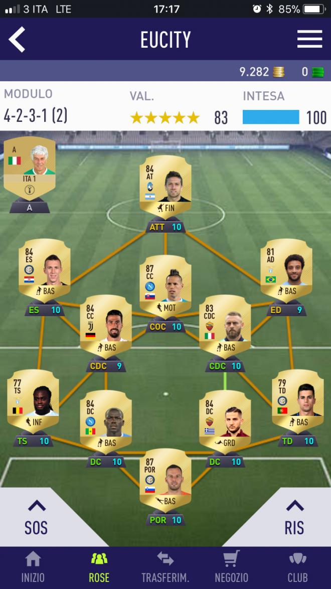 Il fatto è che hai Hamsik che è molto + forte come CAM, miglior piede sx, miglior shooting, miglior stamina, sono tutte componenti fondamentali, quindi ti conviene sfruttarlo al posto di Borja. Felipe è una scelta low cost, ce l'ho anche io ma prevedo di rimpiazzarlo presto. Dybala da solo costa tipo 400k nella versione gold solo lui, te l'ho spiegato ha poco senso risparmiare così a lungo e intanto avere la squadra molto sotto quanto si può fare, procedi a step intermedi e poi vendi, ti ritrovi la squadra + forte sicuro di volta in volta. Btw Ghoulam if é uno spreco di crediti, vendilo e prenditi lukaku della Lazio, é troppo lento ghoulam come terzino.
