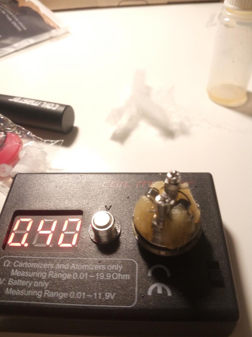 Fatto un po di prove e non sapendo dove sbattere la testa smonto di nuovo tutto e attacco sulla batteria solo la parte bassa dell'atom dove cioè ci sono le spire e il cotone per vedere se la resistenza viene letta correttamente e tadaaaan: