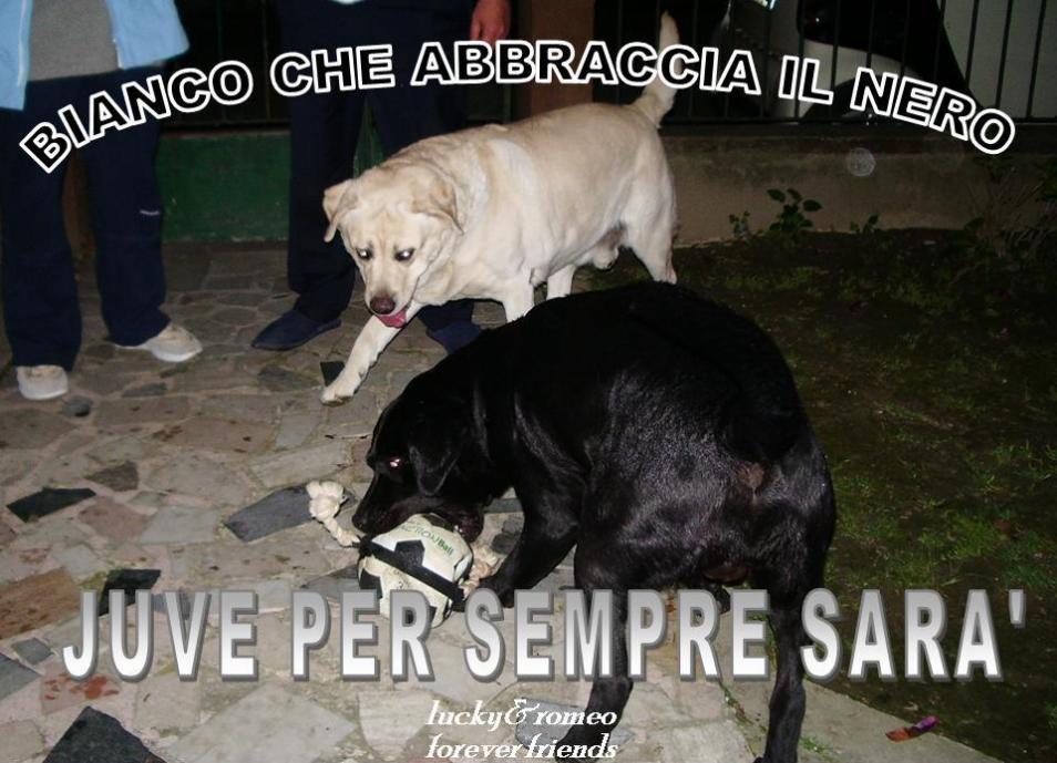 Ci tengo a precisare una cosa perchè potrebbero nascere malintesi, odio la juve. però la mia compagna mi ha girato questa foto e visto che aspettava questo scudetto da tempo le regalo un po' di visibilità, il nostro cane (quello chiaro) che gioca con il suo amico cane di un'amica vicina di casa, anche loro juventini, tutti quanti, cazzo -.-