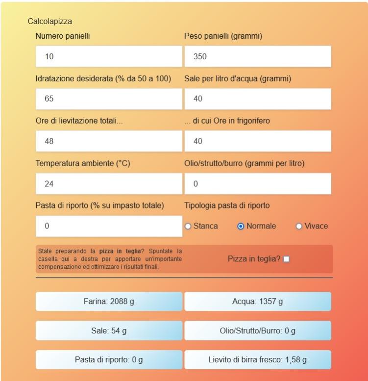 Io non amo esagerare con il sale quindi metto 40 di sale per litro d'acqua, tu puoi alzare a 50 volendo. Non ti ho messo olio (di solito sulla tonda non si usa). Ti ho messo 8 ore fuori dal frigo, ma a seconda della temperatura basterebbero 5 o 6. Ti metto 8 per considerare anche quanto staranno fuori in attesa di essere cotte.