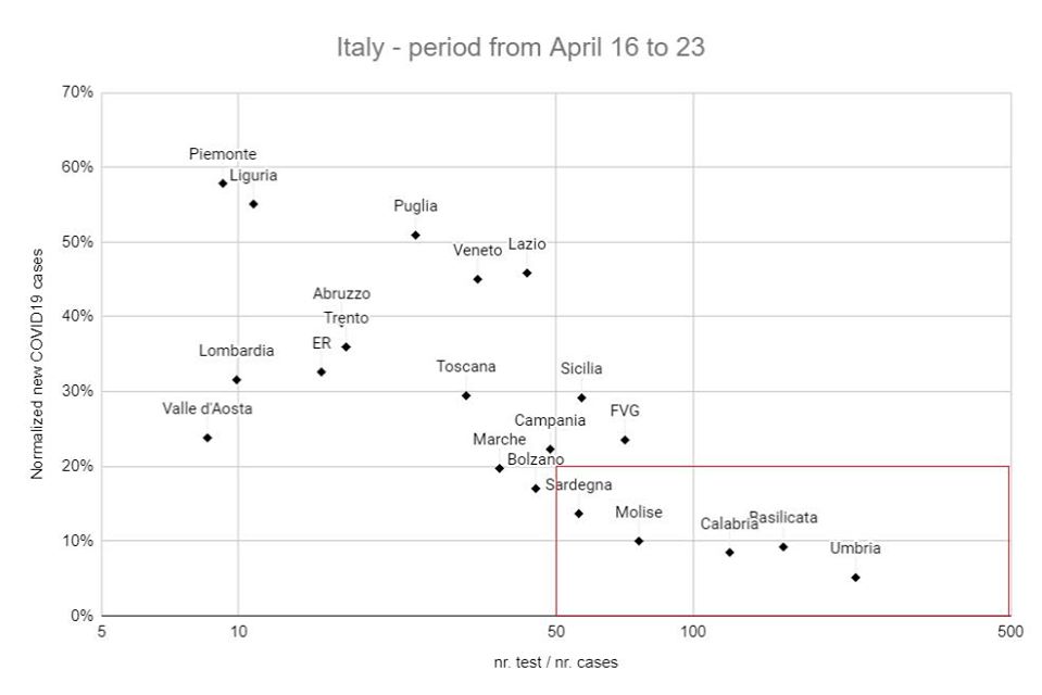 Si vede subito, a dimostrazione di quanto il rapporto test/casi sia fondamentale, che c'è una correlazione abbastanza netta: più si fanno test, prima si riesce a scendere. Ma con differenze che sono evidentemente il frutto di tanti altri fattori, tra cui quelli di cui parlavamo all'inizio. Il rettangolo rosso è la destinazione ottimale, quella in cui bisogna stare per essere pronti ad affrontare una riapertura: pochi nuovi casi (meno del 20% rispetto al picco) e tanti test (più di 50 per ogni nuovo positivo).